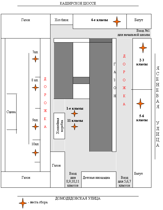 Сбор 5-7 классов - 09.15 (вход со стороны Домодедовской улицы, смотрите на схеме ниже);