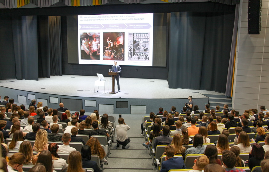 В своей лекции Министр рассказал о промышленной революции XIX века, а также событиях индустриализации ХХ века и перспективах развития промышленной политики России на ближайшее десятилетие.
