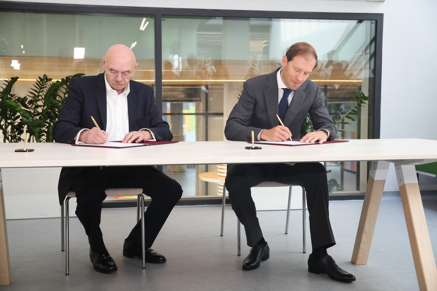 После лекции Денис Валентинович Мантуров и Ефим Лазаревич Рачевский подписали Соглашение о сотрудничестве между Министерством промышленности и торговли Российской Федерации и нашей школой. Это соглашение позволит нашим школьникам участвовать в стажировках и стажировочных программах передовых предприятий России, а также расширит возможности заключения ранних трудовых контрактов для наших старшеклассников с перспективными работодателями и откроет возможности выпускникам нашей школы поступать в лидерские ВУЗы России по программам целевого набора от предприятий.. В завершение Министра познакомили с уникальными мастерскими, лабораториями и студиями нового здания.