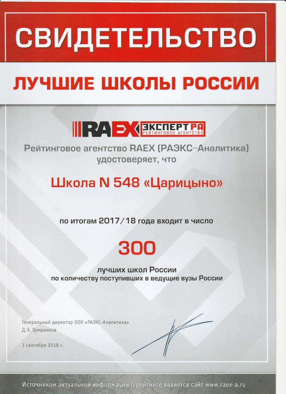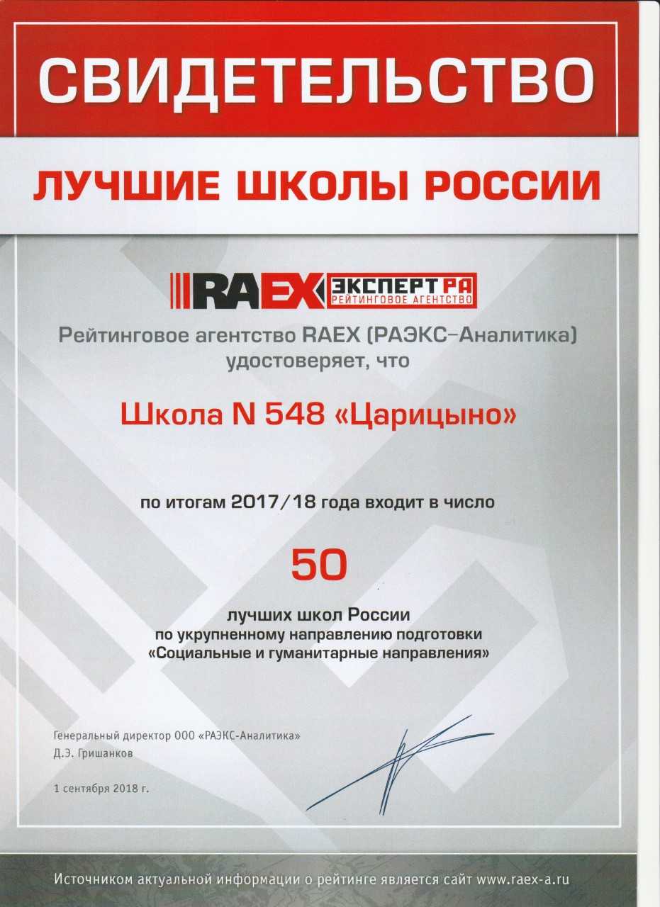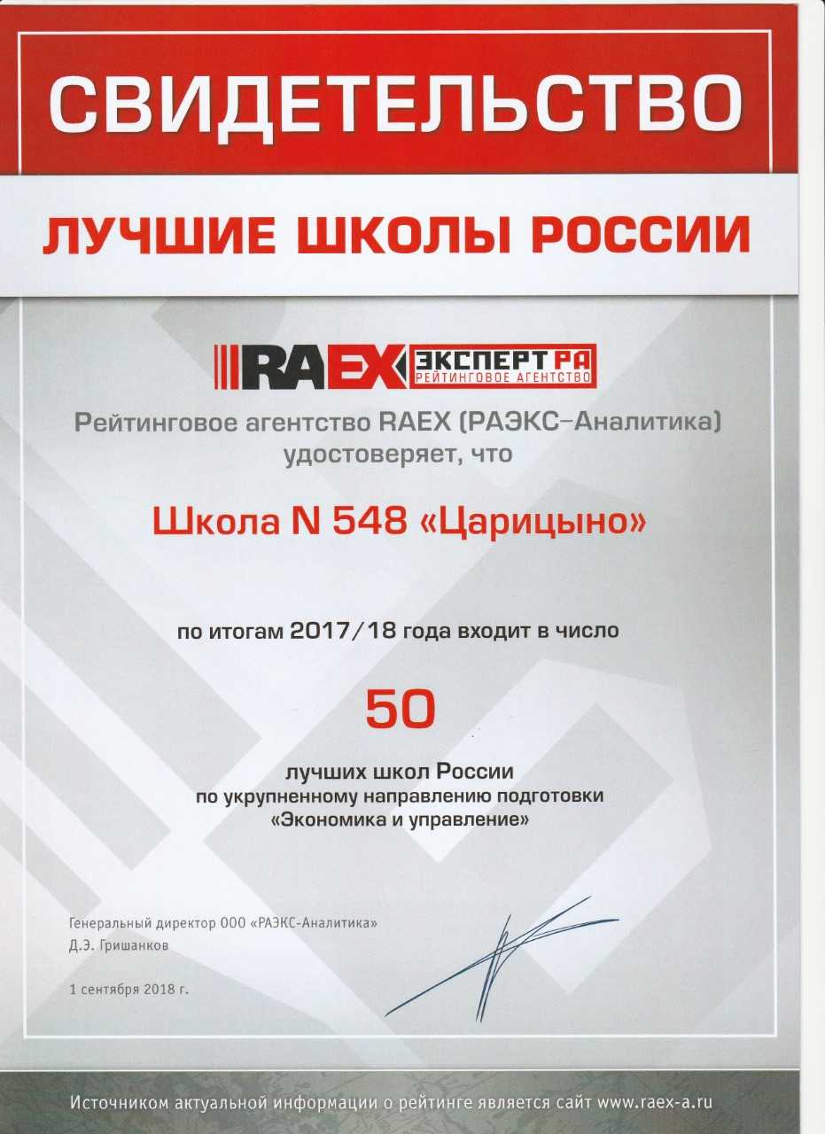 Ещё один рейтинг представило агентство РАЭКС-Аналитика по итогам обработки информации о более чем 125 тыс. выпускниках из 15 тыс. школ страны. Рейтинг школ был составлен по итогам поступления школьников в лучшие вузы России – университеты из топ-30 рейтинга вузов RAEX. Наша школа вошла в топ-50 лучших школ страны сразу в трёх категориях.