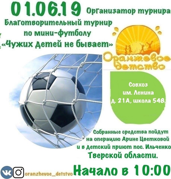 1 июня на стадионе Инженерного корпуса ГАОУ Школа №548 пройдет благотворительный турнир по мини-футболу. Проводят его учителя нашей школы и инициативная группа "Оранжевое детство". Приглашаем к участию в турнире взрослых и детей (в том числе сборные команды детей и родителей), а также зрителей, для которых будут проведены мастер-классы и спортивные игры. Все собранные средства будут переданы социально-реабилитационному приюту пос. Ильченко Тверской области и семье Арины Цветковой на операцию (подробности в группах: Instagram https://www.instagram.com/oranzhevoe_detstvo/ и VK: https://vk.com/oranzhevoe__detstvo). Просим распространить эту информацию.